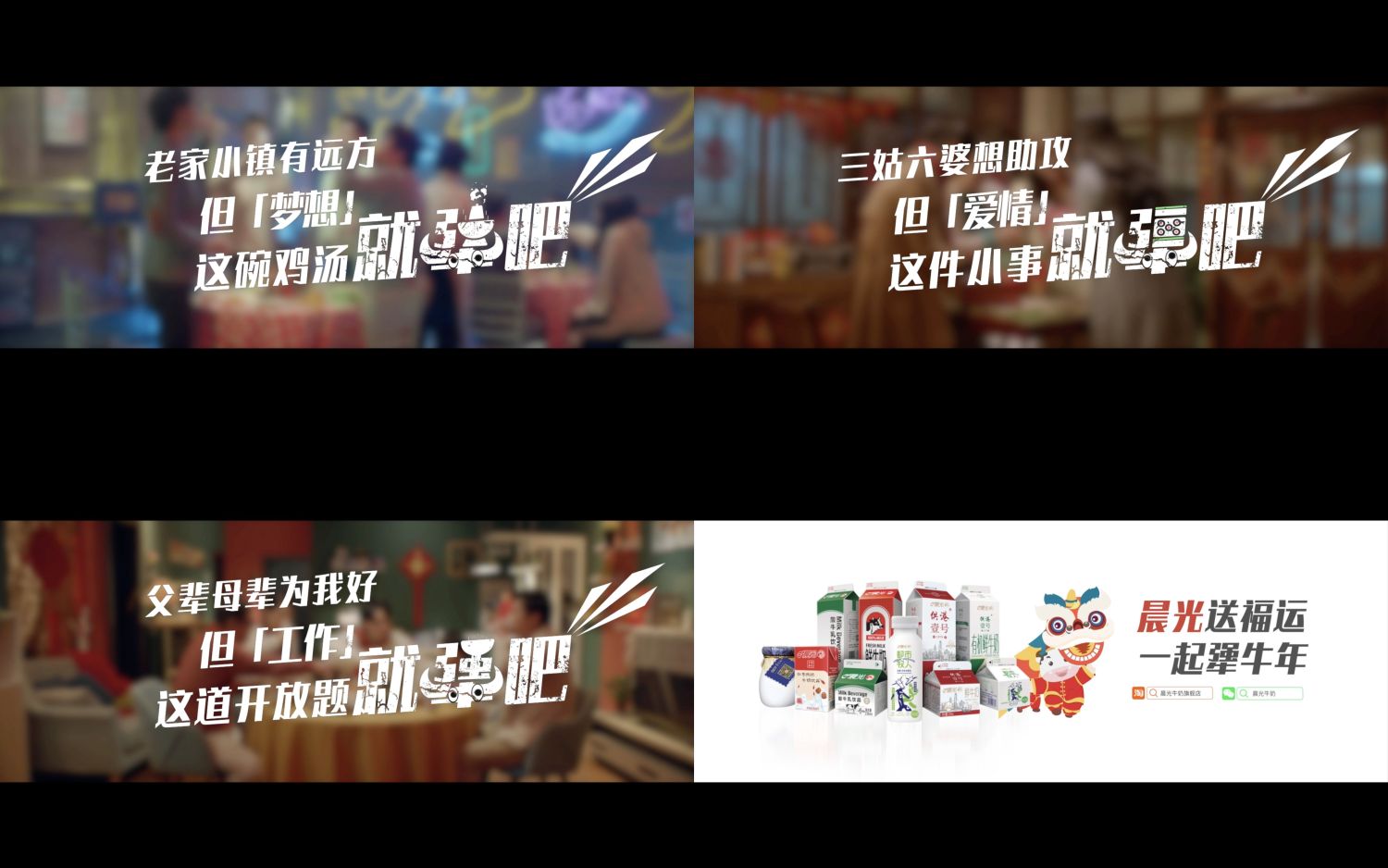 1月29日,晨光乳業(yè)《就犟吧》賀歲TVC微信、朋友圈正式上線,就春節(jié)熱門(mén)話題“結(jié)婚、找穩(wěn)定工作、要不要外出追夢(mèng)”進(jìn)行了生動(dòng)演繹。在熱鬧喜慶的年節(jié)氛圍中,趣味反轉(zhuǎn)的劇情,形象展現(xiàn)了新一代年輕人對(duì)于工作、愛(ài)情、夢(mèng)想“不服輸、敢堅(jiān)持”的態(tài)度。