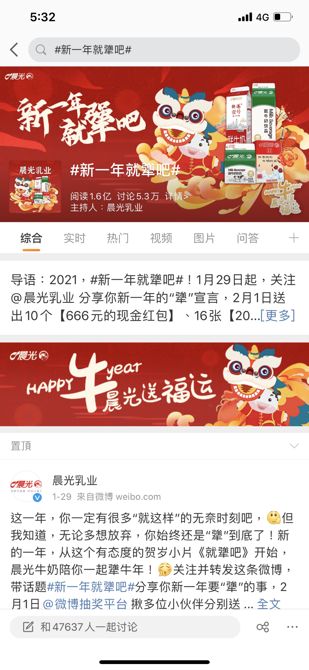 與此同時(shí),@晨光牛奶發(fā)起“犟到底”話題分享抽獎(jiǎng)活動(dòng),以“666元紅包”等“牛氣”獎(jiǎng)品刺激用戶(hù)參與話題討論。最終,話題 #新一年就犟吧#登陸微博熱搜榜第6位,僅兩日吸引1.5萬(wàn)人參與討論,話題閱讀量突破1.6億。