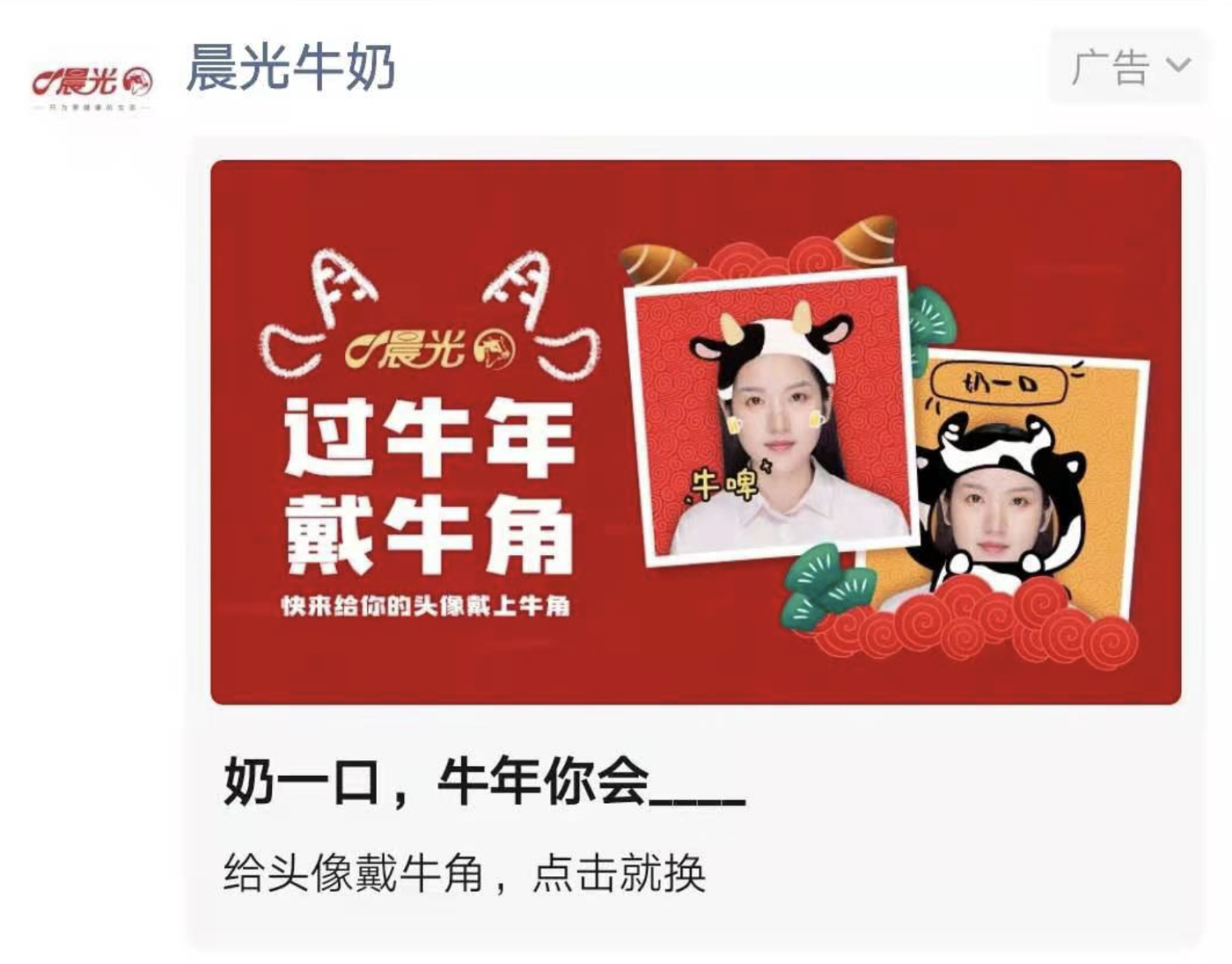 春節(jié),正是各大品牌爭(zhēng)相出招時(shí)刻,如何在一眾營(yíng)銷(xiāo)活動(dòng)中突出重圍吸引用戶(hù)關(guān)注?洞察到用戶(hù)在春節(jié)期間“換個(gè)喜慶頭像”以及“發(fā)紅包”的強(qiáng)需求,晨光乳業(yè)趣味游戲H5“換個(gè)頭像犟牛年”和“定制紅包”于除夕前上線,邀請(qǐng)用戶(hù)為現(xiàn)有微信頭像戴上“牛角”。牛角頭像不僅可以用于微信,也可用于其他社交平臺(tái)。