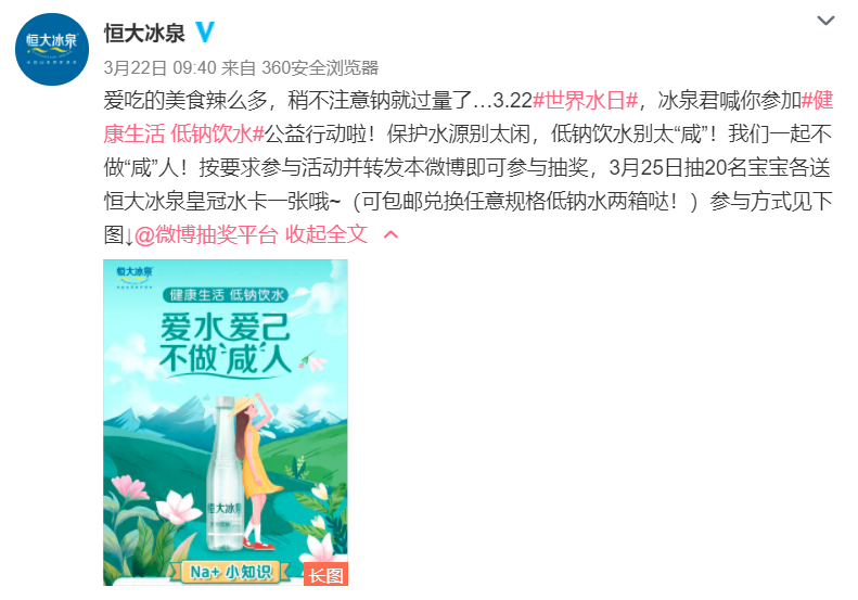見圳客戶端·深圳新聞網2021年3月30日訊 (記者 常軍平)目前正值3月22日第二十九屆“世界水日”以及3月22—28日第三十四屆“中國水周”之際,恒大冰泉天然低鈉礦泉水深入洞察借勢,發(fā)起以不做“咸”人為主題的公益活動,引發(fā)了全網的關注熱議和積極參與,刷屏社交媒體,成為新的公益“爆款”。