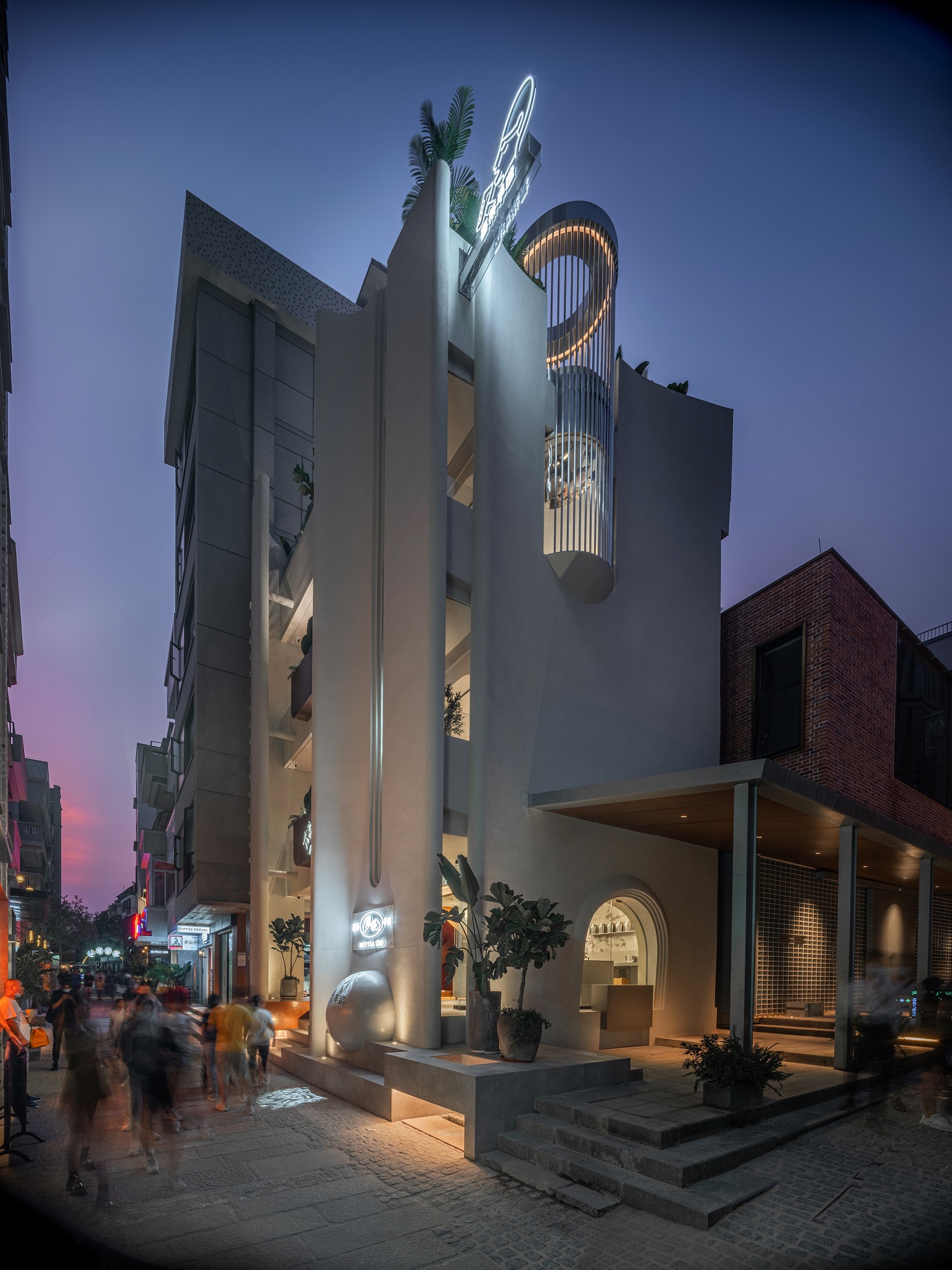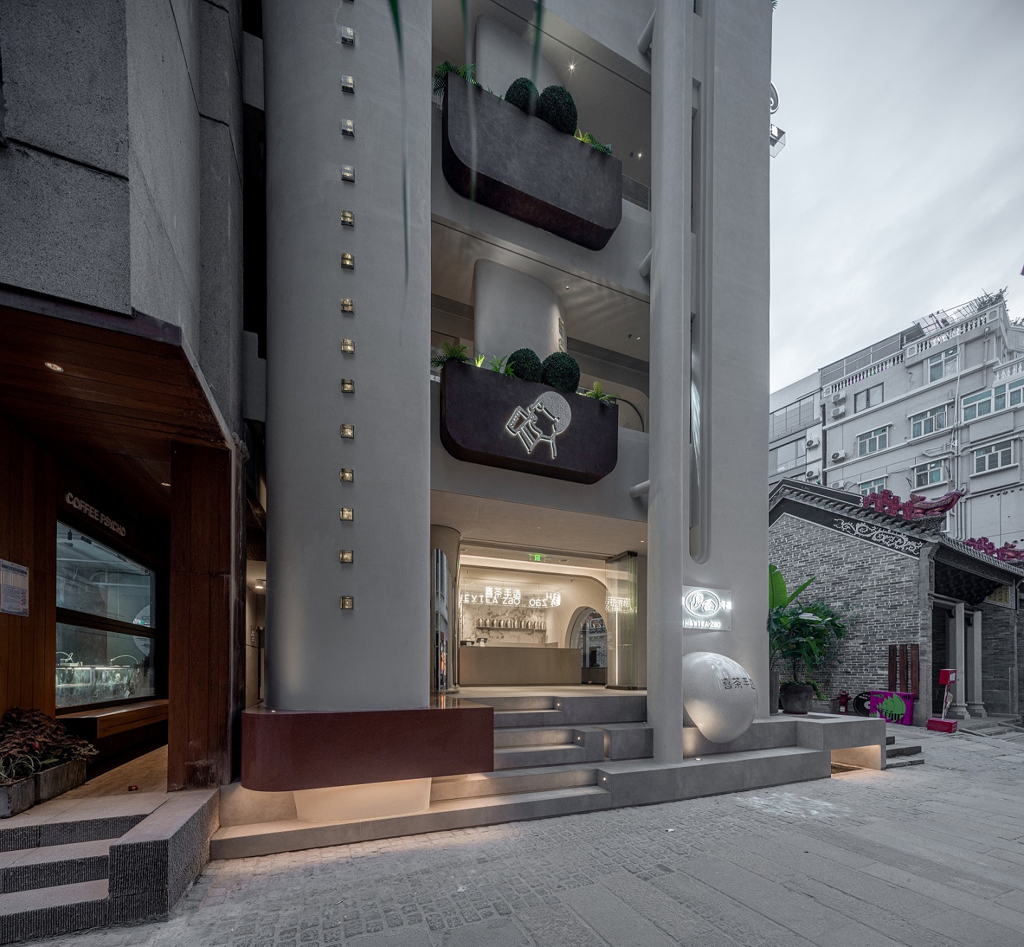 門店整體建筑設(shè)計(jì)是從幾何圖形中抽象出簡(jiǎn)潔線條,改變?cè)韧饬⒚鎲我坏木€性結(jié)構(gòu),突破對(duì)于建筑形態(tài)的固有思維。外立面則選用水紋氣泡玻璃磚、做舊的復(fù)古外墻肌理漆,二、三樓陽(yáng)臺(tái)花槽由銹鐵材質(zhì)制成,強(qiáng)調(diào)歷史感。同時(shí),整體建筑中有一道空凹槽,自上而下?tīng)I(yíng)造水流不息的視覺(jué)感、靈動(dòng)感,形成動(dòng)靜結(jié)合的整體樓面。