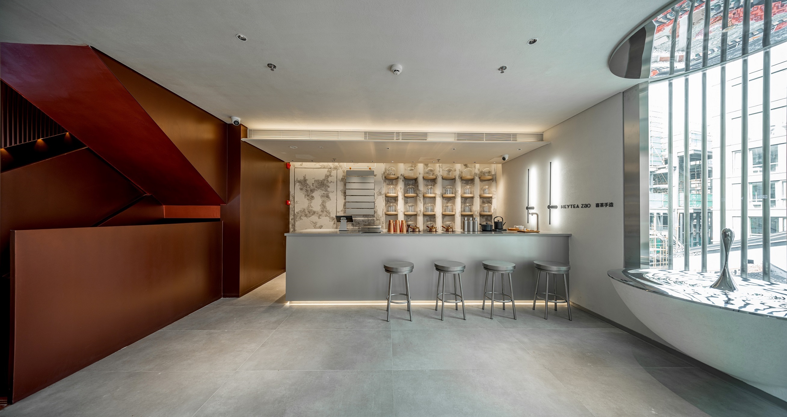 在內(nèi)部設(shè)計(jì)上,喜茶同樣以創(chuàng)新的功能空間設(shè)置和突破性設(shè)計(jì),呼應(yīng)每一樓層的手造主題,升級(jí)了消費(fèi)者的空間體驗(yàn)。喜茶將一樓正門墻體改造為玻璃移門,塑造出通透的門店空間;變封閉窗戶為開(kāi)放的門,讓顧客看得見(jiàn)手造產(chǎn)品的全過(guò)程。此外,在用色與材質(zhì)搭配上,門店內(nèi)部整體采用嶺南復(fù)古紅與現(xiàn)代極簡(jiǎn)白搭配,做舊復(fù)古肌理漆與現(xiàn)代化金屬材質(zhì)呼應(yīng),不僅有效進(jìn)行功能分區(qū),還體現(xiàn)歷史感與現(xiàn)代感的對(duì)比、融合。