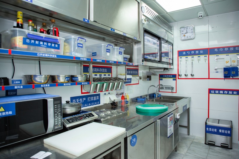 “右手邊是冷菜間,因為食安要求更高,我們都有專門的‘二次更衣室’,在這里更換衣服后,再進(jìn)入對涼菜進(jìn)行處理?!必?fù)責(zé)人表示,在專門的涼菜區(qū)里,則可以看到櫥窗中整齊地貼上了諸如“A1圣女果”“B04魚豆腐”之類的標(biāo)簽,同時備注“當(dāng)天生產(chǎn)打烊廢棄”和“加工日期與廢棄日期”等具體操作指示?!懊客泶蜢群?,我們也會用紫外線燈對冷菜間進(jìn)行半個小時的消毒。”負(fù)責(zé)人補(bǔ)充。