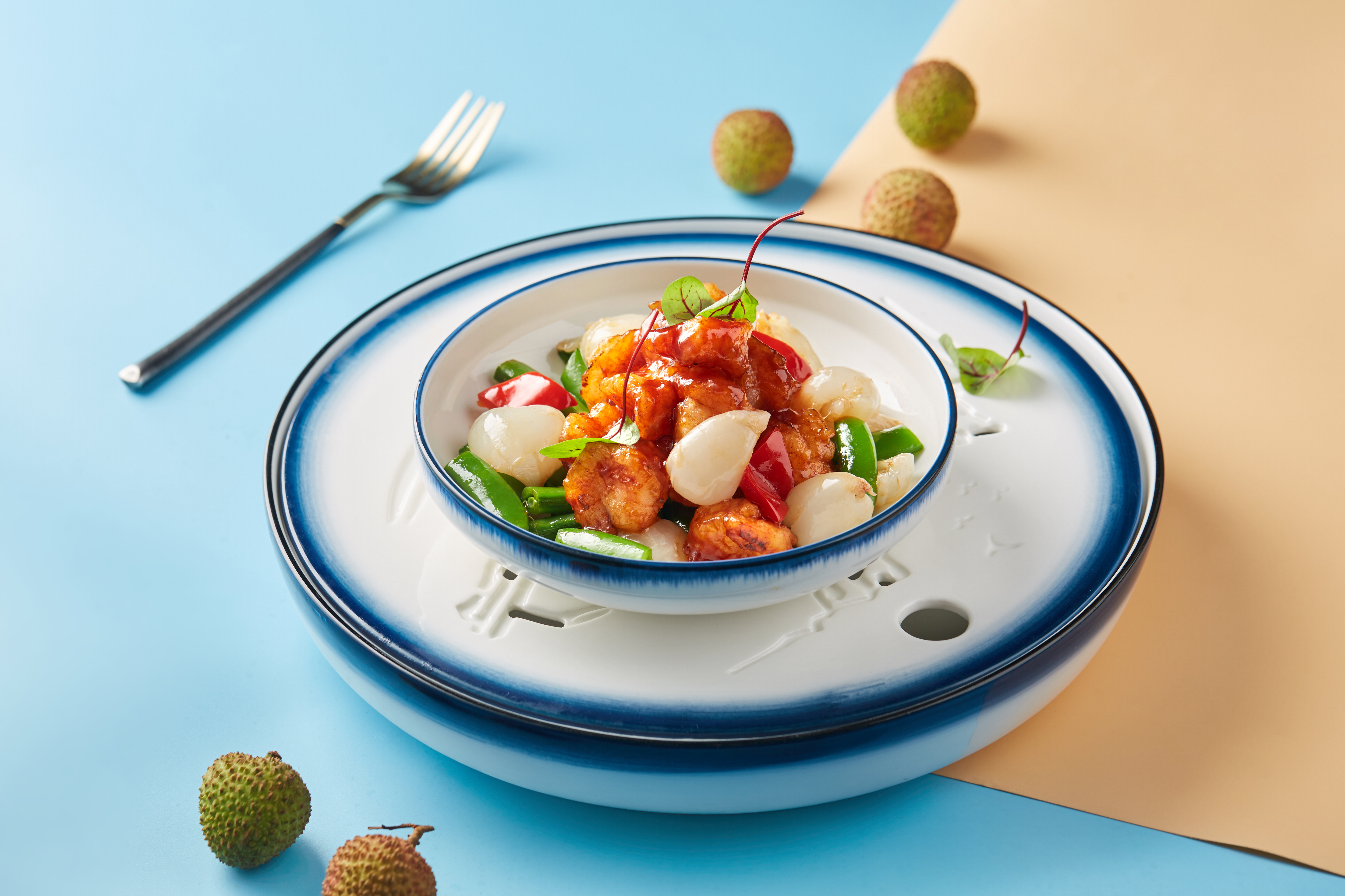 粵菜師傅延續(xù)舊日食風,巧妙設(shè)計,將荔枝肉與蝦仁共燴-碧綠蝦仁炒荔枝肉.