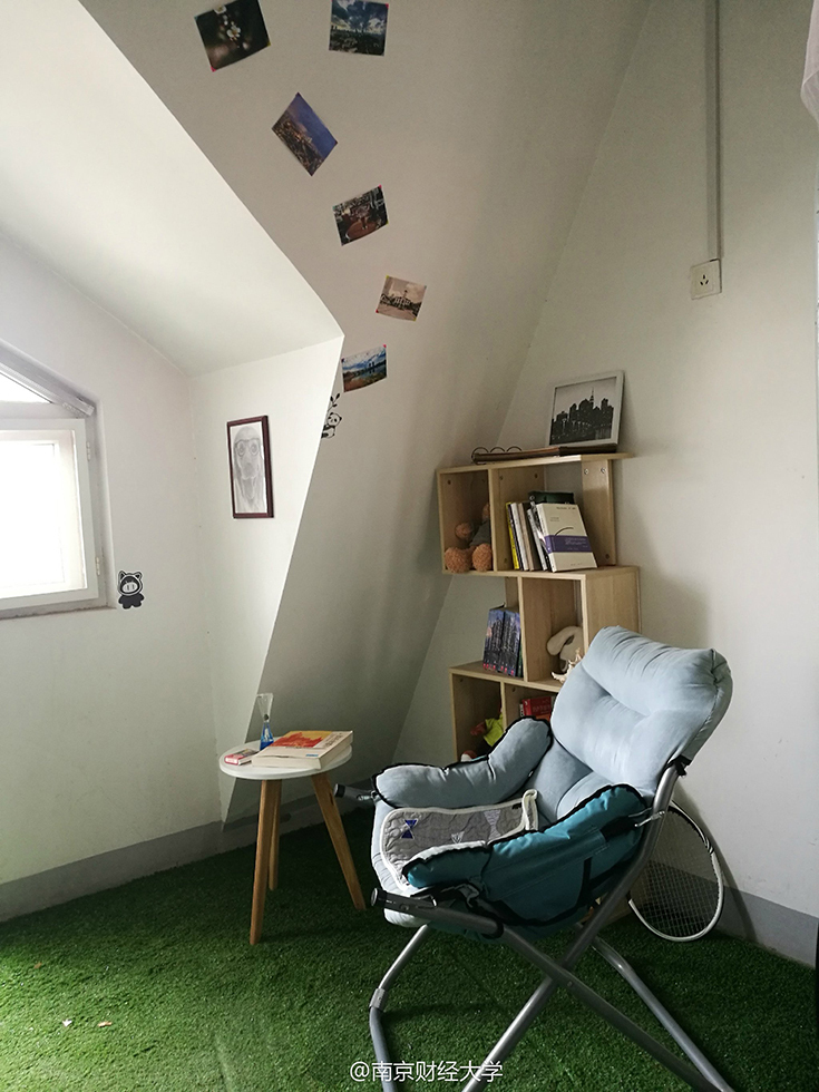 綿綿的草坪、充滿設(shè)計(jì)感的書架、掛著素描畫的墻……難以想象這是四個(gè)19歲男生的寢室。南京財(cái)經(jīng)大學(xué)西苑9幢男生宿舍頂樓602寢室,住著4位“世外高人”—— 涂貴平、柯毅、劉以康和廉鎮(zhèn)宇,他們用事實(shí)告訴大家,男生宿舍文藝起來,可絲毫不輸女生。