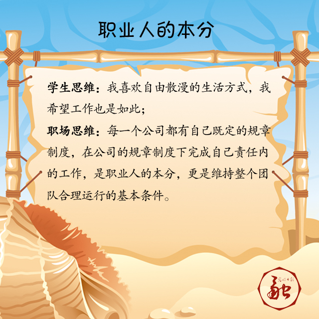 職場思維:每一個公司都有自己既定的規(guī)章制度,在公司的規(guī)章制度下完成自己責(zé)任內(nèi)的工作,是職業(yè)人的本分,更是維持整個團隊合理運行的基本條件。