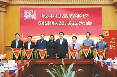 福田區(qū)領(lǐng)導(dǎo)為“城中村品牌學(xué)校聯(lián)盟”成員校授旗。