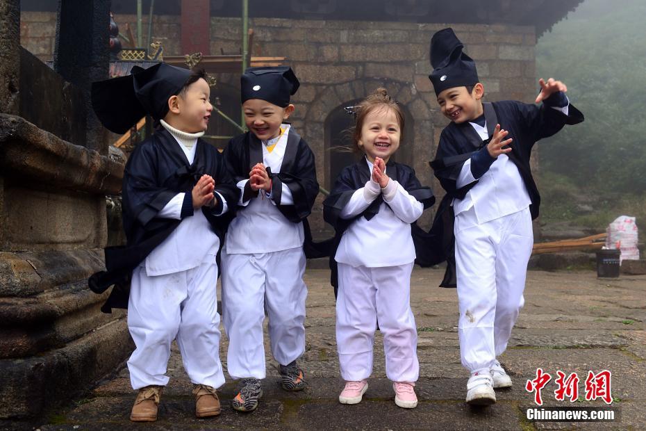 10月16日,在“道教名山”、世界自然遺產(chǎn)地江西上饒三清山,5名來(lái)自中外的萌娃身穿統(tǒng)一道服,手持竹簡(jiǎn),在三清宮跟著道教師傅朗讀《道德經(jīng)》、《弟子規(guī)》,學(xué)習(xí)太極拳、書法、古箏等中國(guó)傳統(tǒng)文化。這群萌娃中年齡最小的僅11個(gè)月,年齡最大也只有6歲。程希雪攝