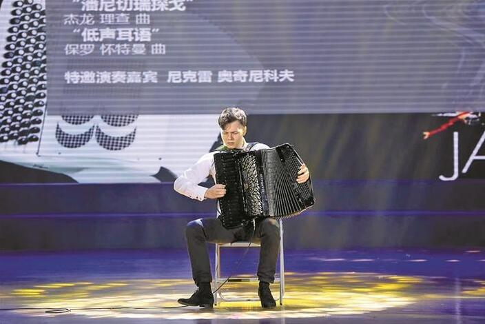 ▲俄羅斯青年手風(fēng)琴演奏家尼科雷·奧奇尼科夫現(xiàn)場(chǎng)演奏。