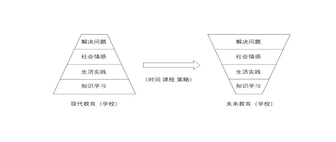 如果說未來教育要超越現(xiàn)代教育,必須把四個層次的權(quán)重倒置過來,如圖所示,即從時間、課程和策略上做根本性的認識和改變。