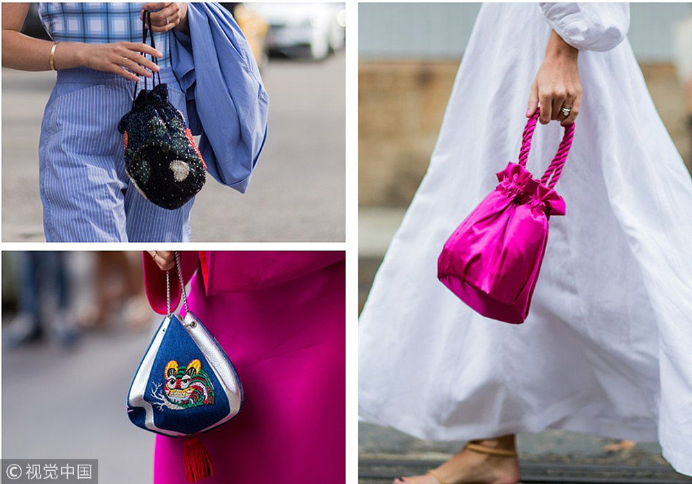 ????現(xiàn)在的時尚簡直就是上一秒是天堂,下一秒是地獄的Feel。也許之前是個不起眼的小物件,下一秒就是時髦單品Top1了,都不敢這么玩的。抽繩口袋,遍布各大超市、菜市場,或者是你家的收納袋,就這樣一個不起眼的布口袋,就這樣成功“洗白”上位,成為新晉IT Bag。簡簡單單一個布口袋,拎著就走,真是看多了還覺著很好看啊~(圖片來源:視覺中國)