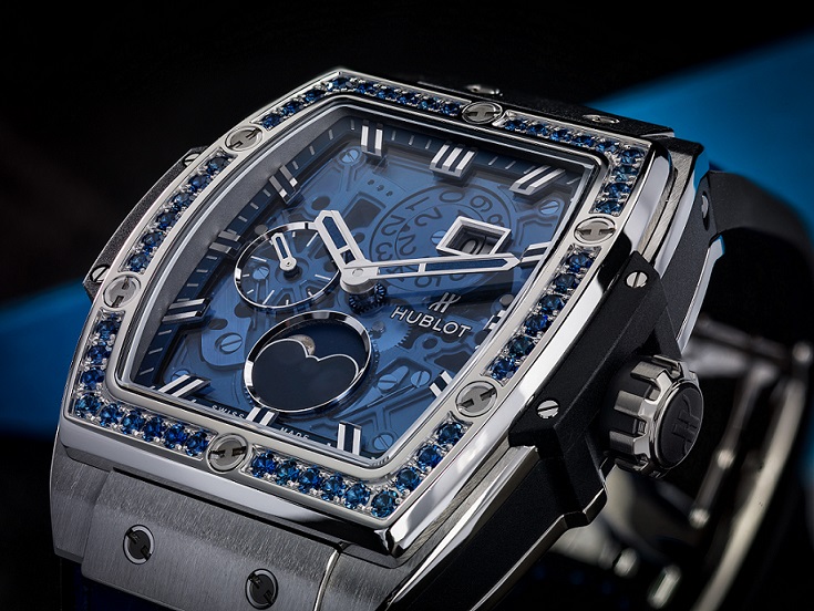 Big Bang靈魂系列月相鈦金藍色與王金紫色腕表,表圈分別鑲嵌48顆藍色藍寶石和紫水晶,搭載藍色和紫色短吻鱷魚皮內(nèi)襯黑色橡膠表帶,整體均被賦予同色系,一氣呵成,營造時尚與質(zhì)感的和諧統(tǒng)一,成就大氣而簡約的都市格調(diào)。Big Bang靈魂系列月相鈦金白色鑲鉆與王金款,一白一黑,宛如月明與月影的使者,記錄月輪的氤氳光影。(吳艷)