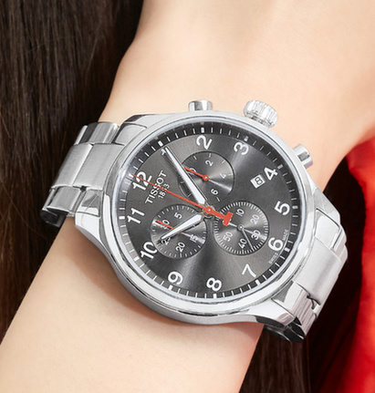 腕表表殼由316L精鋼材質(zhì)打造而成,具備良好的耐腐蝕性和耐久性。表殼正面以拋光打磨處理,側(cè)面則經(jīng)過拉絲處理,呈現(xiàn)出兩種不一樣的觀感。從側(cè)面我們可以感受到這款腕表的曲線線條之美,自然流暢的弧度符合人體美學(xué),佩戴時更加貼合手腕。精鋼表冠采用防滑紋理設(shè)計,以拋光打磨細節(jié),便于調(diào)校時間。表冠上面鐫刻“T”字樣,簡約又美觀。2點鐘和4點鐘位置設(shè)置計時按鈕,可以啟動、停止計時以及歸零復(fù)位。黑色表盤飾以太陽光紋,帶來迷人的色彩漸變效果。三個計時功能盤井然有序地排列在表盤上,看起來依舊簡潔大方。4點鐘位置設(shè)有日期顯示窗口,增添腕表的實用性。