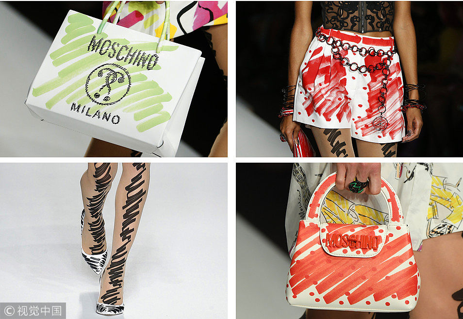 Moschino 2019春夏系列發(fā)布會(huì)于當(dāng)?shù)貢r(shí)間20日在米蘭舉行,滿場(chǎng)的涂鴉元素好玩的不得了,信手涂鴉在服飾和配飾上,瞬間放下束縛回歸本真,帶你追憶無(wú)憂無(wú)慮的孩童時(shí)代~ (圖片來(lái)源:視覺(jué)中國(guó))