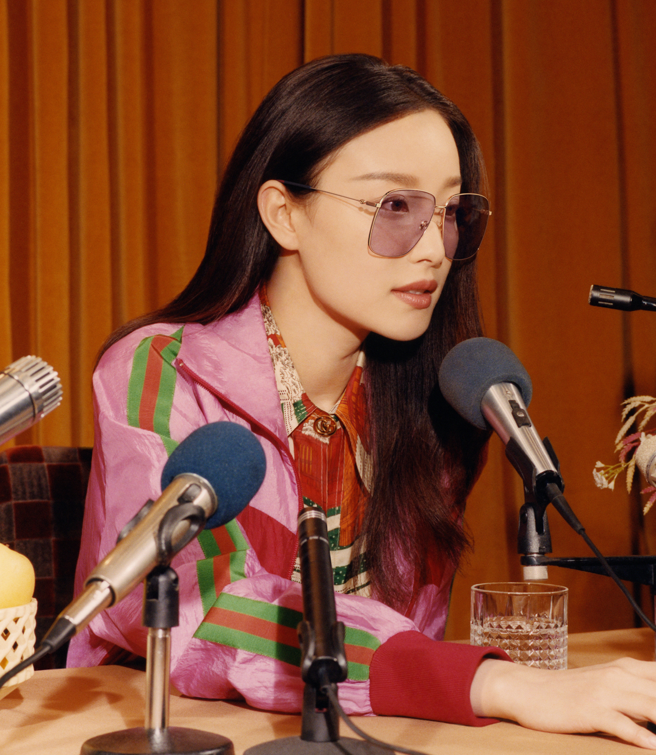 在廣告大片中,倪妮精彩演繹最新眼鏡系列,分別佩戴超大號光學眼鏡和淺粉色太陽鏡,展現(xiàn)別具一格的復古摩登。大黃蜂,雙G標識,經(jīng)典條紋點綴于鏡片,鉸鏈及鏡腿,設計簡約精致,極具當代風格。