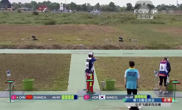 第十組比賽,張鑫秋與康金允前四靶都打中,第五靶張鑫秋率先出槍,打中,隨后出槍的康金允稍顯緊張,結(jié)果打失。這樣,張鑫秋以45靶破亞運會成績奪得冠軍,康金允獲得亞軍。