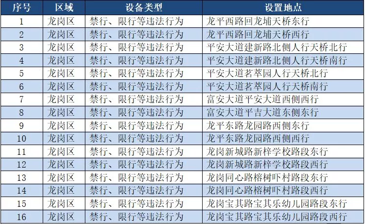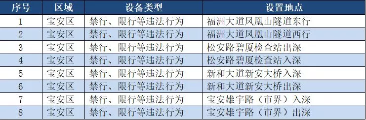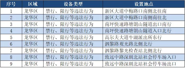 另外,重點整治機(jī)動車禁行、限行等多種違法行為的交通技術(shù)監(jiān)控設(shè)備,深圳交警公布啟用87套。涉及福田區(qū)、羅湖區(qū)、南山區(qū)、寶安區(qū)、龍崗區(qū)、龍華區(qū)、光明新區(qū)、坪山區(qū)、大鵬新區(qū)等9個區(qū)域。