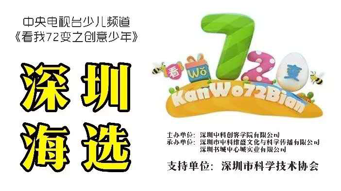 9月15日(本周六),央視“看我72變”欄目組將聯(lián)合深圳市科學技術(shù)協(xié)會、深圳市中心書城、中科創(chuàng)造力實驗室,在中心書城大臺階舉辦第10屆“看我72變”之創(chuàng)意少年(深圳賽區(qū))的海選。只要你的孩子有創(chuàng)意有想法,都可以來到中心書城參加海選,發(fā)揮自我創(chuàng)意,結(jié)識新朋友。征集節(jié)目類型包括但不限于藝術(shù)創(chuàng)意表演:舞蹈、音樂、書法、輪滑、體育類等,科技創(chuàng)意:科技作品展示等,優(yōu)勝者將有機會登陸央視舞臺參加節(jié)目錄制。