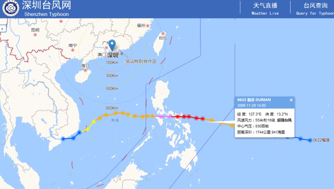 臺風“榴蓮”(泰國命名)是2006年11月30日在菲律賓登陸的超強臺風,雖然對我國沒有什么風雨影響,但在菲律賓卻造成了上百人死亡、失蹤以及近100萬人直接受災,并且其二次登陸也給越南造成了上百艘船艇沉沒。