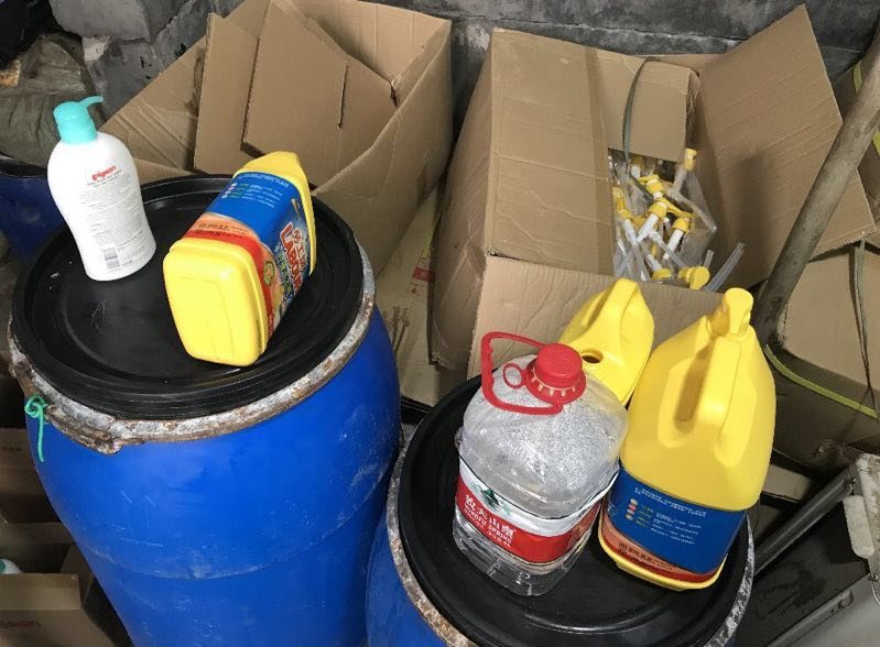 經(jīng)過執(zhí)法人員檢查,發(fā)現(xiàn)現(xiàn)場有疑似用來制作洗潔精、消毒液等的原料和工具,現(xiàn)場一些箱子中還有未灌裝的空罐子以及一些待貼標簽。據(jù)了解,當事人從外面以低廉價格買來比較劣質、不知名的原料,通過簡單勾兌,再分裝成知名品牌日化用品。