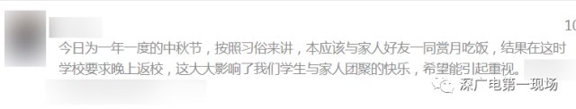 今天,深圳市高級中學(xué)、深圳市福田中學(xué)、沙井中學(xué)、東方英文書院的一些高中學(xué)生,通過在線留言等多種方式,向欄目反映,中秋節(jié)是法定假日,但他們卻沒法和家人一起吃飯團聚,更別提賞月看晚會了,原因是學(xué)校要求寄宿的學(xué)生今天晚上要提早返校,參加晚自習(xí)或者考試。