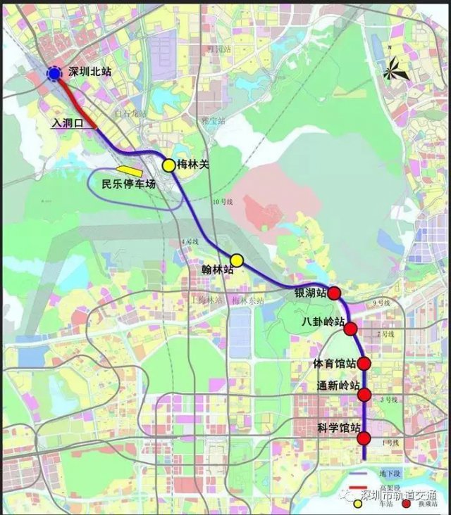 6號線二期工程線路全長約11.8Km,包括7站7區(qū)間、其中換乘車站4座,從深圳北站預留高架橋工程引出,途徑龍華、福田、羅湖三區(qū)。