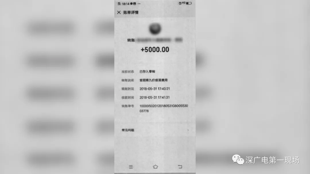 今年5月份,寶安的郭小姐接到前同事蔣某的推銷電話,自稱可以預約到香港注射HPV9價疫苗,而郭小姐剛好有這方面的需求,眼看辦公室的好多女生都轉(zhuǎn)錢找蔣某預約,自己不假思索也轉(zhuǎn)了五千。
