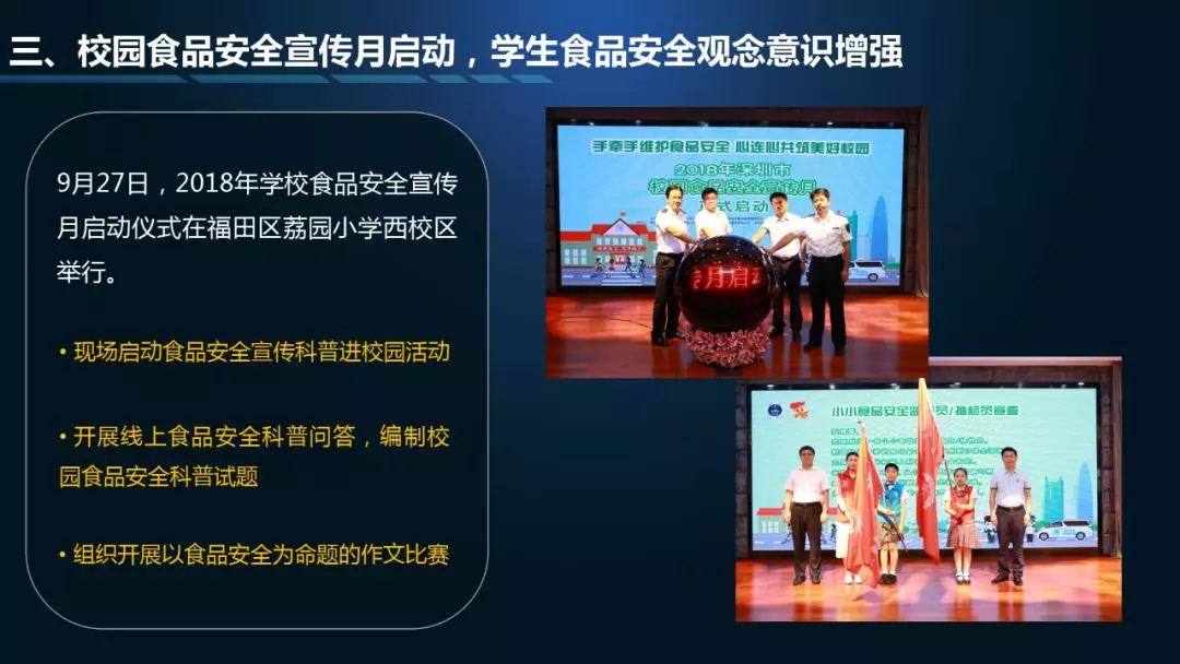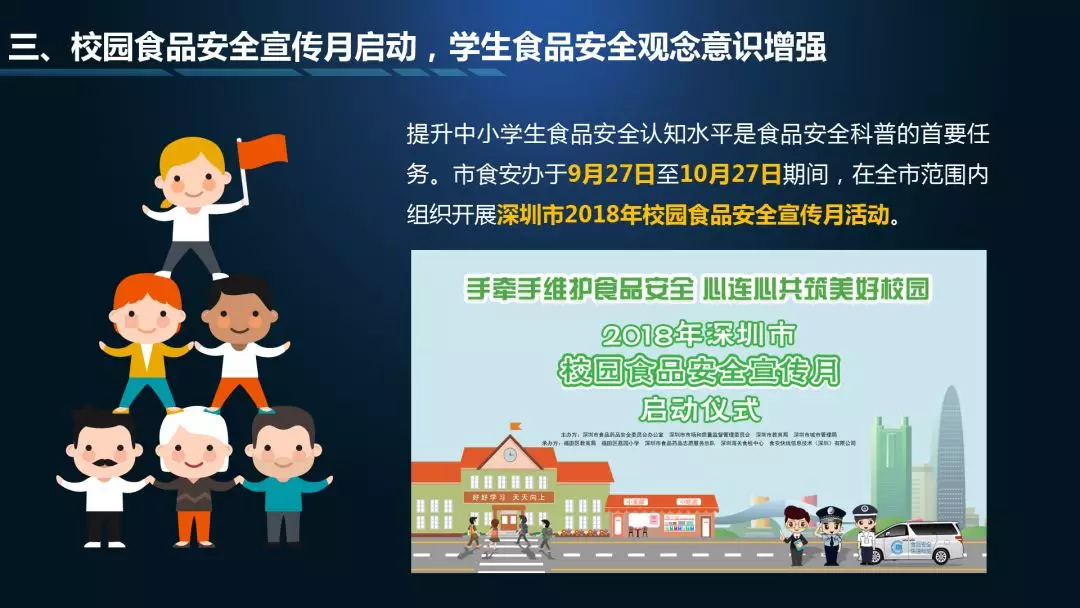 第一個“3”指“九號查酒”節(jié)前專項行動、校園食品安全宣傳月、深圳市食藥志愿者總隊開展打擊非法售賣活禽專項執(zhí)法行動等情況通報;