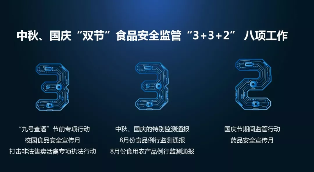 發(fā)布會對中秋、國慶“雙節(jié)”食品安全監(jiān)管“3+3+2”共八項工作進(jìn)行發(fā)布: