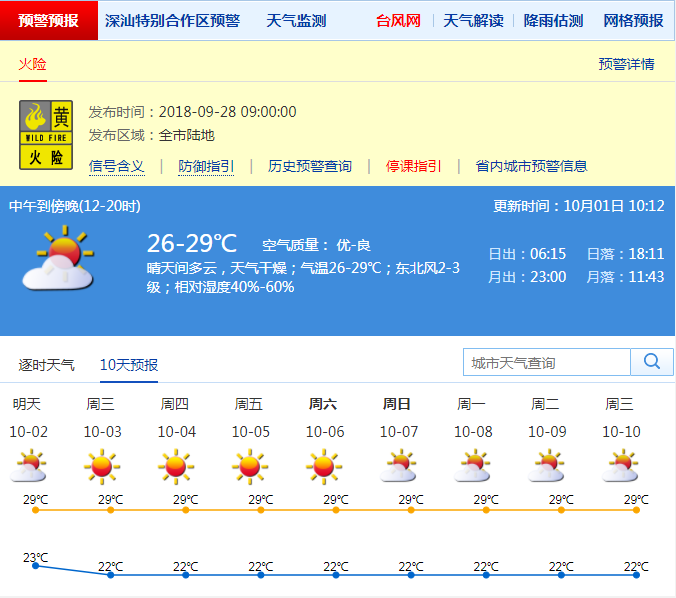 今天是長假第一天,我市白天晴到多云,早晚最低氣溫徘徊在23℃左右,中午前后最高氣溫升至29℃,天氣舒適。東北風(fēng)2~3級,最小相對濕度50%,最大相對濕度80%,天氣干燥,注意補(bǔ)充水分。