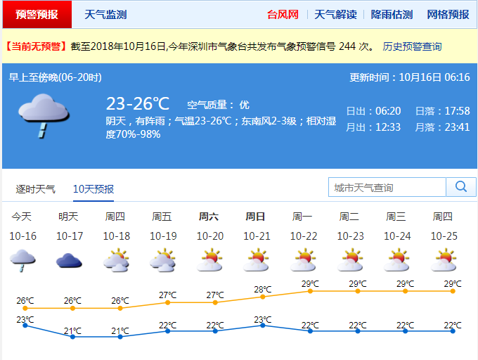 受弱冷空氣和切變線共同影響,16日深圳陰天有中到大雨,局部暴雨,伴有零散雷暴和5~6級陣風。預(yù)計降雨將在中午前后減弱,氣溫下降3 ℃~4 ℃,最低氣溫低至21 ℃,最高氣溫在25 ℃左右。17日陰天間多云,偶有零星小雨,氣溫在21 ℃ ~26 ℃。18日起轉(zhuǎn)為多云到晴天,早晚清涼,空氣干燥。