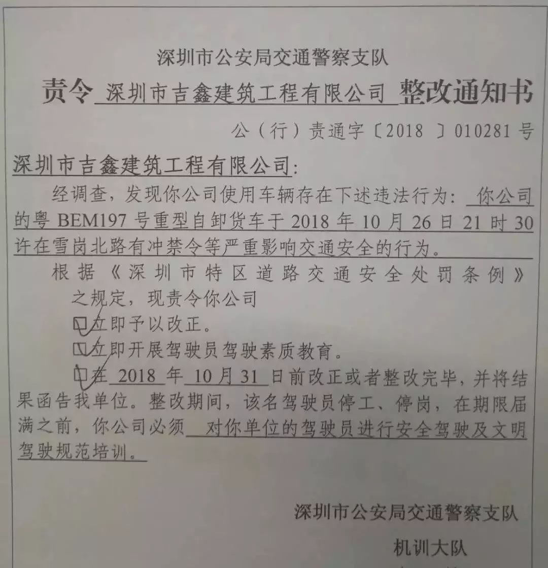深圳交警依法對深圳市吉鑫建筑工程有限公司下達(dá)整改通知書,責(zé)令公司進(jìn)行整改: