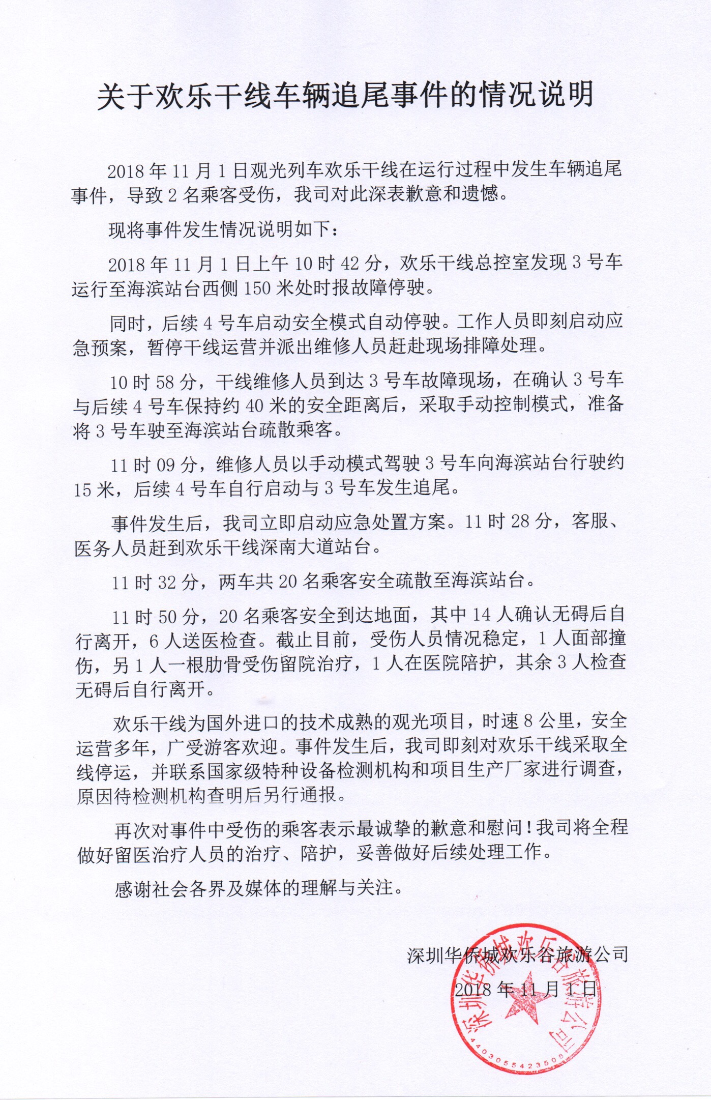 11月1日19時(shí),歡樂(lè)谷旅游公司發(fā)布追尾事件情況說(shuō)明,并向受傷乘客表示歉意。目前歡樂(lè)干線(xiàn)已全線(xiàn)停運(yùn)。