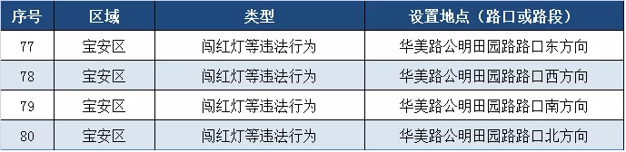 深圳新聞網(wǎng)11月5日訊(記者 何暢)據(jù)“深圳交警權(quán)威發(fā)布”微信公眾號消息,近期深圳交警公布啟用115套交通技術(shù)監(jiān)控設(shè)備,重點(diǎn)整治違法停車、沖紅燈、超速、逆行、不按車道方向行駛、占用公交車道等多種違法行為。其中福田區(qū)56套,羅湖區(qū)20套,寶安區(qū)4套,光明區(qū)35套。