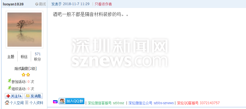 深圳新聞網(wǎng)11月7日訊(記者 施冰冰)11月6日,有網(wǎng)友在論壇爆料稱民治藍(lán)坤大廈米蘭國際酒吧每晚營業(yè)至凌晨4點(diǎn),音樂聲震耳欲聾,嚴(yán)重影響了附近居民的睡眠,“逼得”該網(wǎng)友只能搬家。(網(wǎng)帖地址:https://szbbs.sznews.com/thread-3815241-1-1.html)