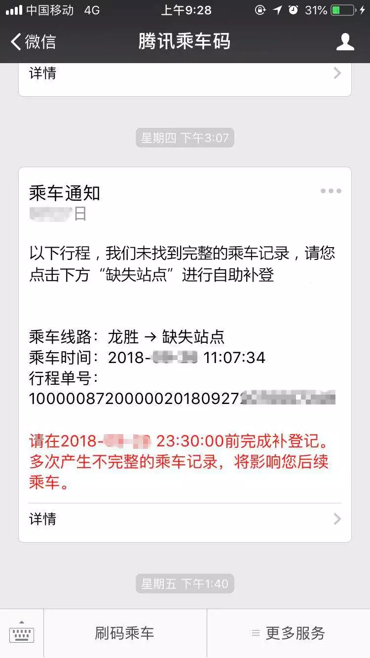 劉先生家住龍崗,工作地在福田,經(jīng)常乘坐地鐵往返于六約站和福田站。自從深圳地鐵上線了二維碼掃碼過閘功能,劉先生出門就只帶一部手機(jī),每天都是輕裝上陣,進(jìn)站乘車非常方便。11月7日這天,劉先生的手機(jī)微信突然收到一條推送信息,提醒他前一天早上的乘車信息不完整,需要進(jìn)行“補(bǔ)登”操作,這究竟是怎么一回事呢?