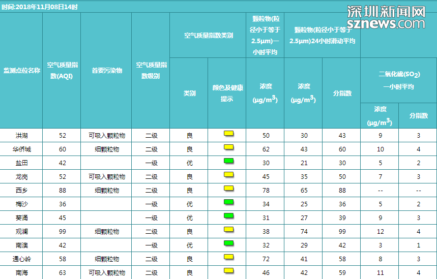 深圳市人居環(huán)境委員會(huì)于2018年11月8日14時(shí)發(fā)布空氣質(zhì)量時(shí)報(bào)