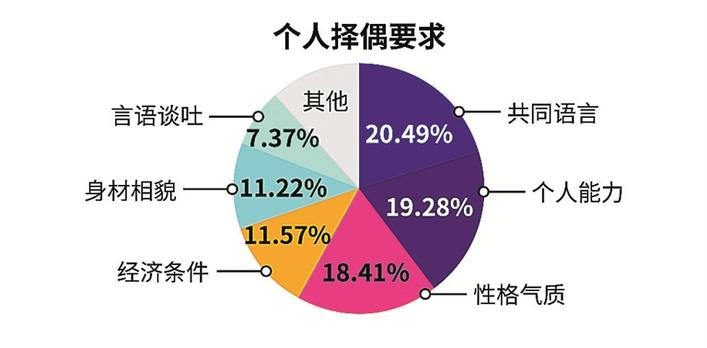 調(diào)查顯示,共同語言、個(gè)人能力、性格氣質(zhì)為單身男女在擇偶時(shí)最看重的三個(gè)方面,其次為經(jīng)濟(jì)條件、身材相貌、言語談吐??梢?,相較于過去條件上的匹配,更重視精神上的契合。