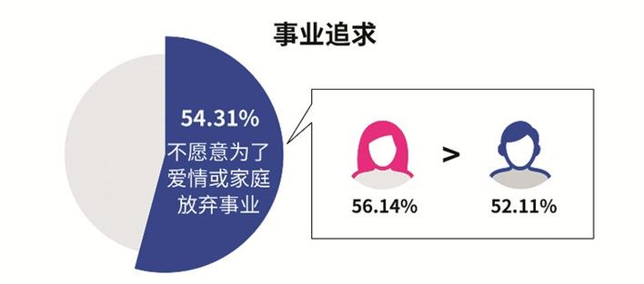 對(duì)于許多人而言,愛情和事業(yè)沖突的抉擇已經(jīng)越來越常見。調(diào)查顯示,54.31%的單身男女不愿意為了愛情或家庭放棄自己的事業(yè)。從男女差異看,56.14%的女性表示不愿意為了愛情或家庭放棄自己的職場(chǎng)或事業(yè),高于男性??梢?,女性對(duì)于事業(yè)的追求正在逐漸提升。