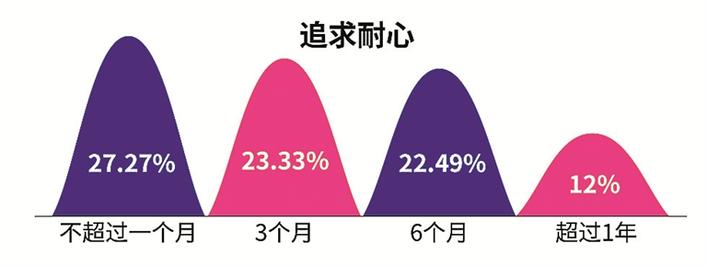 在追求耐心方面,有超七成單身男女追求愛情的時(shí)間不超過半年,其中27.27%的單身表示對(duì)喜歡的人追求時(shí)間不超過一個(gè)月,23.33%的人追求時(shí)間為3個(gè)月,另外有22.49%愿意追求時(shí)間為6個(gè)月,僅有12%的單身男女追求喜歡的人愿意超過1年。