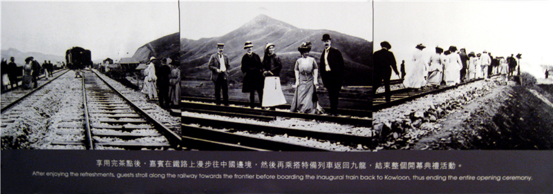 左邊第一張圖為1911年10月15日九廣鐵路全線(xiàn)通車(chē)現(xiàn)場(chǎng),右邊兩張圖為參加通車(chē)典禮的中英嘉賓的活動(dòng)場(chǎng)景
