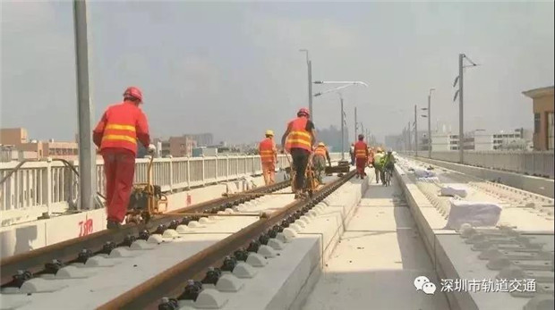 從施工現(xiàn)場(chǎng)可以看到,鋪軌機(jī)把長(zhǎng)軌放入無(wú)碴道床就位,當(dāng)鋼軌最后精準(zhǔn)就位后,要求正負(fù)誤差不超過(guò)1毫米。目前鋪軌進(jìn)度至少每天7公里,11日上午從金沙站開始不停歇作業(yè),到下午兩點(diǎn)鋪軌作業(yè)已臨近深圳。項(xiàng)目建設(shè)者表示,大約本月20號(hào)鋪設(shè)到深圳機(jī)場(chǎng)北站。