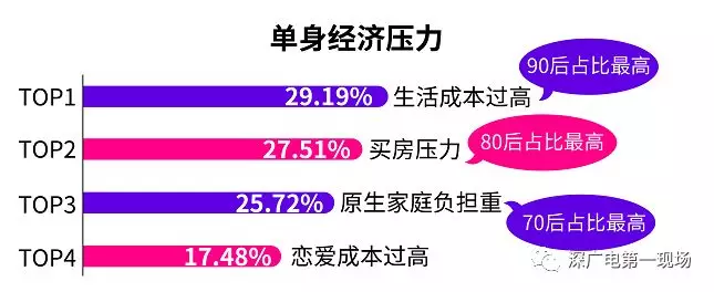 脫單難點(diǎn)中的經(jīng)濟(jì)壓力層面分析發(fā)現(xiàn),生活成本過(guò)高是影響脫單的最大單身壓力,其次是買房壓力,原生家庭負(fù)擔(dān)重以及戀愛(ài)成本過(guò)高。