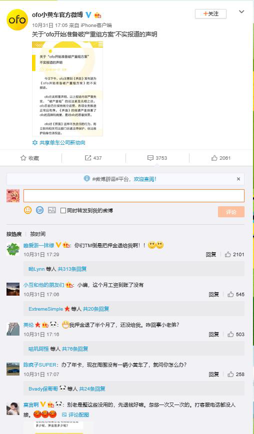 根據深圳市消費者委員會官網公布的消息,今年針對ofo的投訴增長迅速。1月1日至9月13日,投訴數量為58宗。截至11月14日,僅2個月時間,投訴增加180起,總數達238宗。