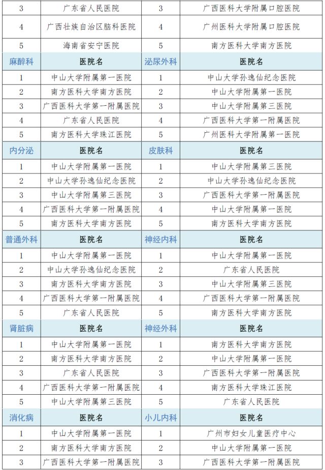 此外,廣東進入全國??魄笆钠渌麑?朴?中山三院的風濕科;廣州市精神衛(wèi)生中心(廣州惠愛醫(yī)院)的精神醫(yī)學;中山大學光華口腔醫(yī)院的口腔科;中山大學孫逸仙紀念醫(yī)院的泌尿外科、內(nèi)分泌科;廣州市婦兒中心的小兒外科;廣州醫(yī)科大學附屬第一醫(yī)院的胸外科;中山大學附屬腫瘤醫(yī)院的胸外科與腫瘤學。