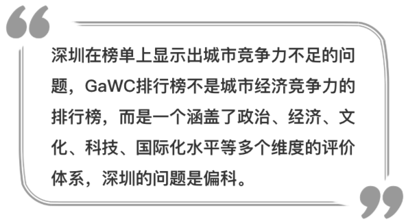 從GaWC發(fā)布的榜單和評(píng)價(jià)體系可以看出,深圳雖然在經(jīng)濟(jì)實(shí)力和經(jīng)濟(jì)總量上已經(jīng)取得了較大發(fā)展,但城市國(guó)際綜合競(jìng)爭(zhēng)力尤其是城市軟實(shí)力還存在明顯差距,“偏科”的現(xiàn)象仍然沒有改變。