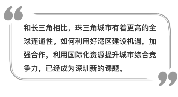 不過,深圳在國(guó)際交往便利度、跨國(guó)公司地區(qū)總部、現(xiàn)代服務(wù)業(yè)、國(guó)際航線、國(guó)際會(huì)展資源、使領(lǐng)館、高等教育方面和其它世界一線城市仍有較大差距。