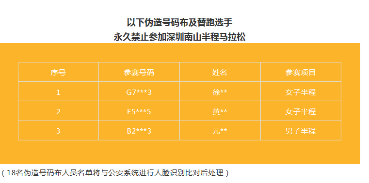 賽事組委會(huì)表示,賽后,他們也一直在整理、分析現(xiàn)場的照片、視頻等素材。期間組委會(huì)也已收到部分新舉報(bào),包括抄近路、套牌及替跑等行為。經(jīng)查證,在2018深圳南山半程馬拉松比賽中,根據(jù)計(jì)時(shí)芯片數(shù)據(jù)、賽會(huì)錄像、現(xiàn)場照片等材料證明,總計(jì)違規(guī)選手人數(shù)258人,其中偽造號(hào)碼布18人,替跑3人,其他違規(guī)行為選手人數(shù)237人(其中穿越綠化帶人數(shù)46人)。經(jīng)組委會(huì)研究決定,按照《2018深圳南山半程馬拉松競賽規(guī)程》第7-8條規(guī)定,對(duì)258名違規(guī)選手作出如下處理,并根據(jù)要求將違規(guī)名單及處理結(jié)果上報(bào)至中國田徑協(xié)會(huì):