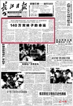 《140萬雙襪子的命運》于1997年7月30日首發(fā)于長江日報一版,獨家報道了武漢襪廠倉庫里積存了兩火車皮襪子,其中最長的沉睡了10年,但是面對眾多商家訂單,工廠卻長年不肯“吐貨”,商家開價越來越低,襪子在一天天貶值。此報道一出,轟動全國,多家媒體轉載,并獲得第八屆中國新聞獎一等獎。