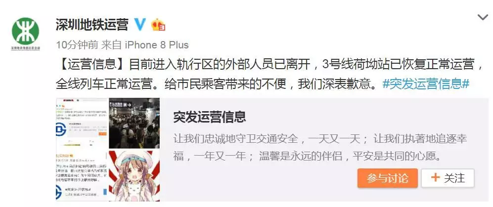 而據(jù)@深圳地鐵運營19點44分消息稱,3號線荷坳站已恢復(fù)正常運營,全線列車正常運營。